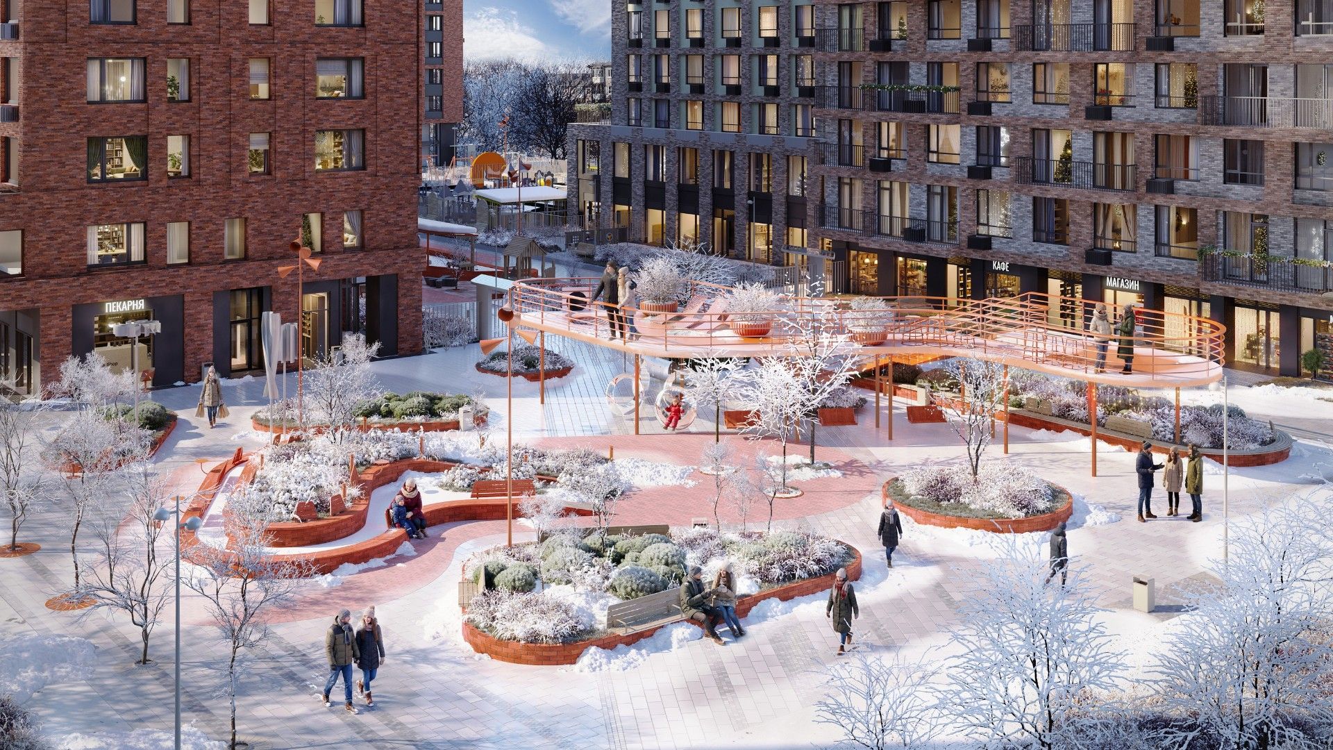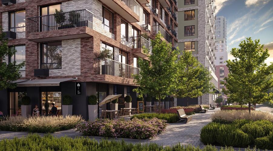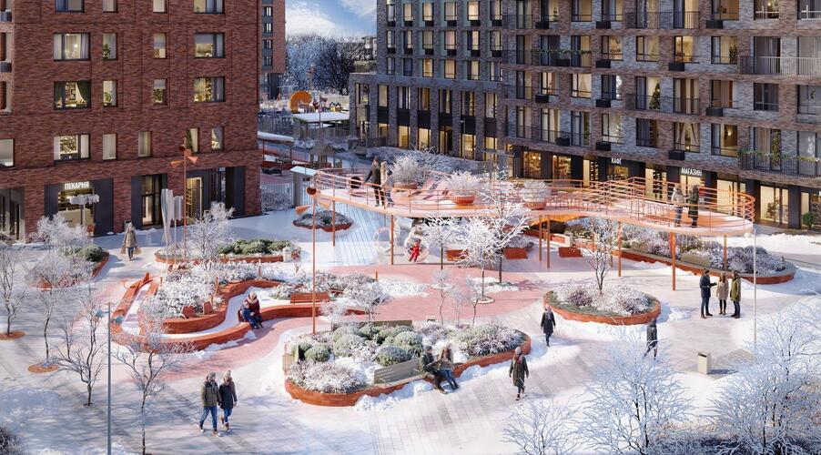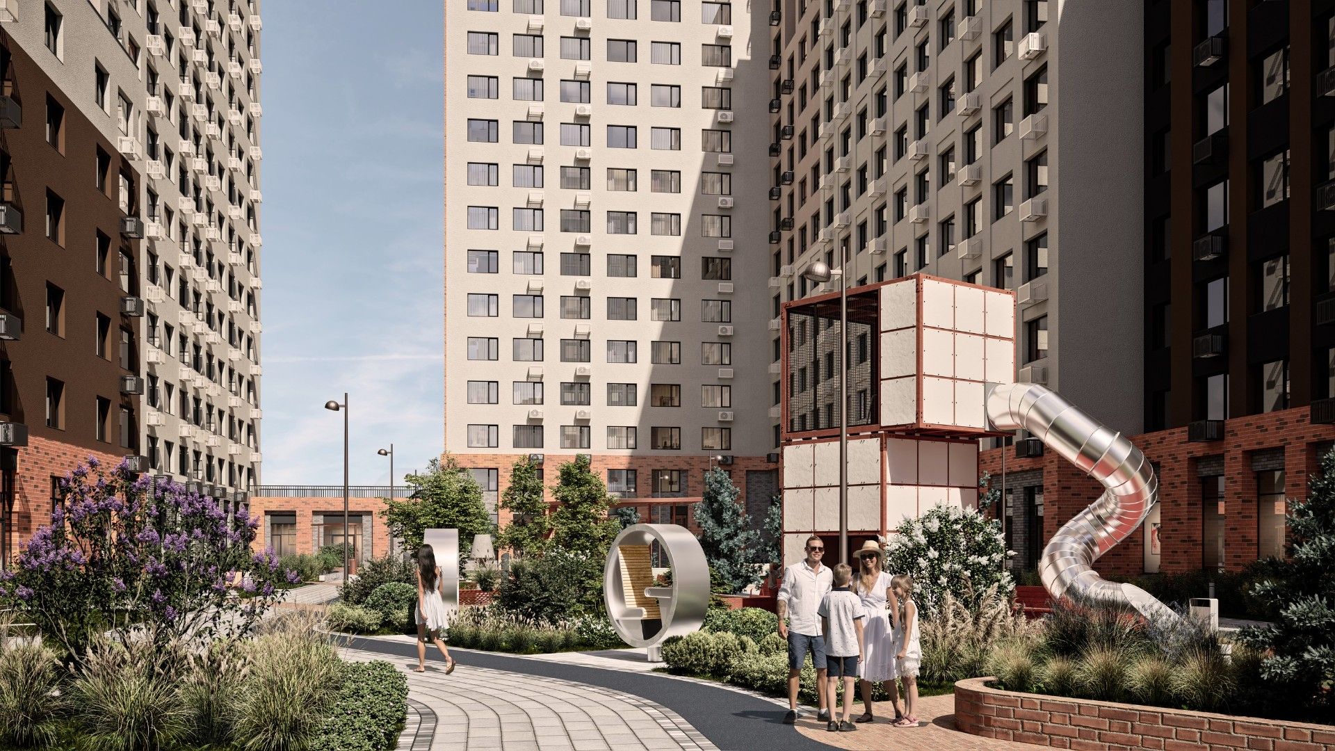 - Для отдыха: Закрытые приватные дворы с зонами релакса (гамаки, подвесные кресла), спортивными зонами (воркаут, настольный теннис) и прогулочный бульвар, переходящий в открытую «городскую гостиную» — мини-парк для жителей всего района.