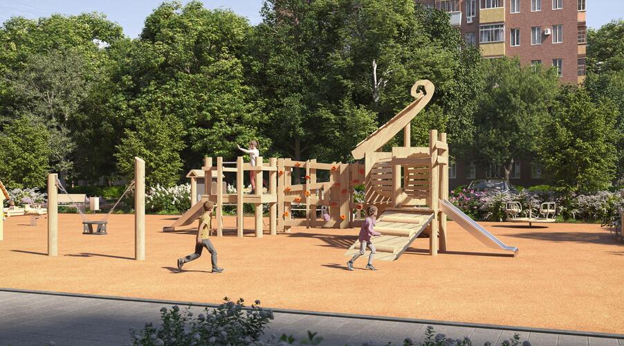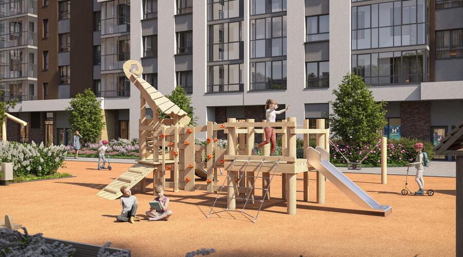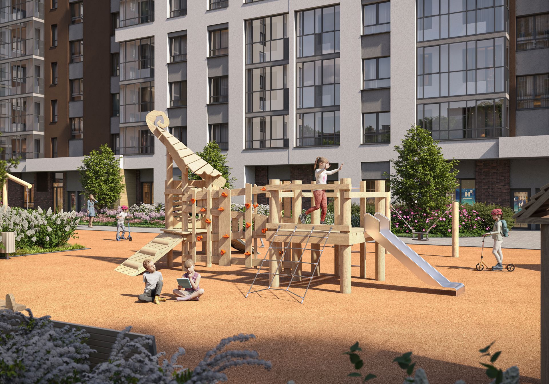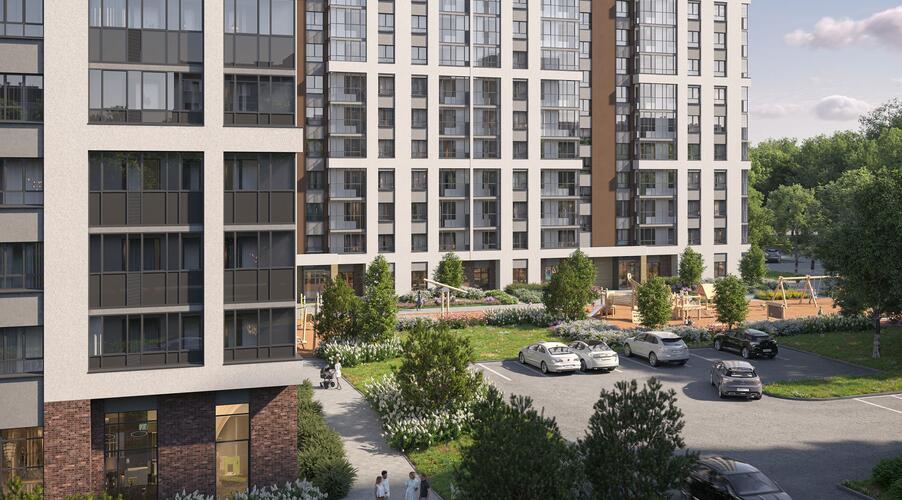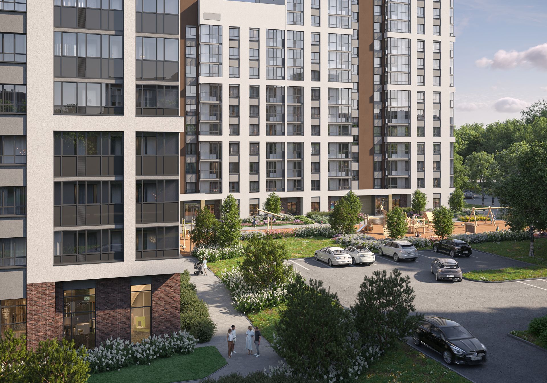 - Благоустройство территории: Проектом предусмотрен озелененный двор, спроектированный по принципу «без машин», с авторским ландшафтным дизайном, детскими и спортивными площадками. Это создает безопасное и эстетичное пространство для общения и отдыха жителей.