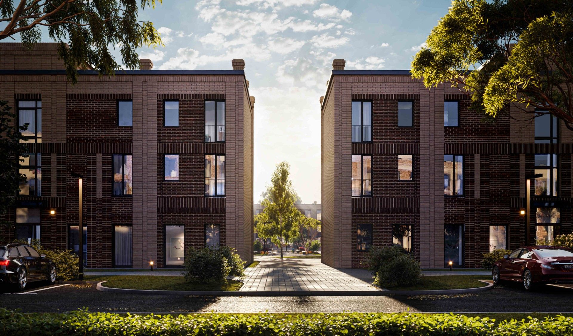 Уникальной особенностью комплекса является реализация концепции «дворы без машин», когда автомобили размещаются на парковках по внешней границе домов.